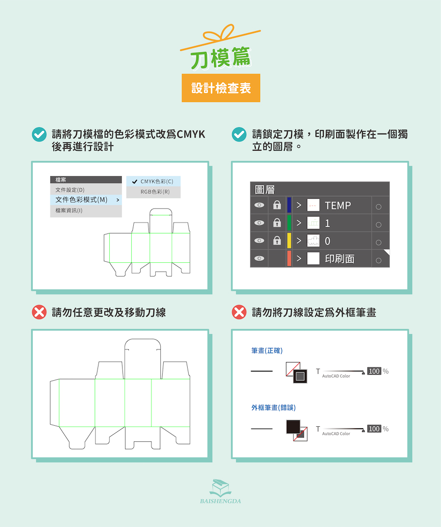刀模(Die-Cut Mold)是用來使紙類印刷品成型的模具,因此印刷前須將設計稿件套用刀模廠提供的刀模線(Dieline),設計師自行繪製的刀模也需經由刀模廠確認是否能作為量產使用。