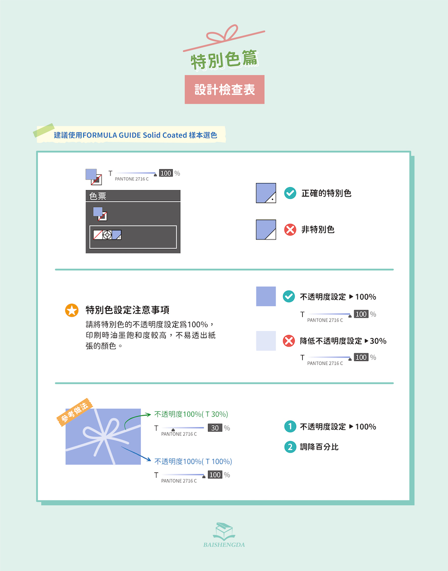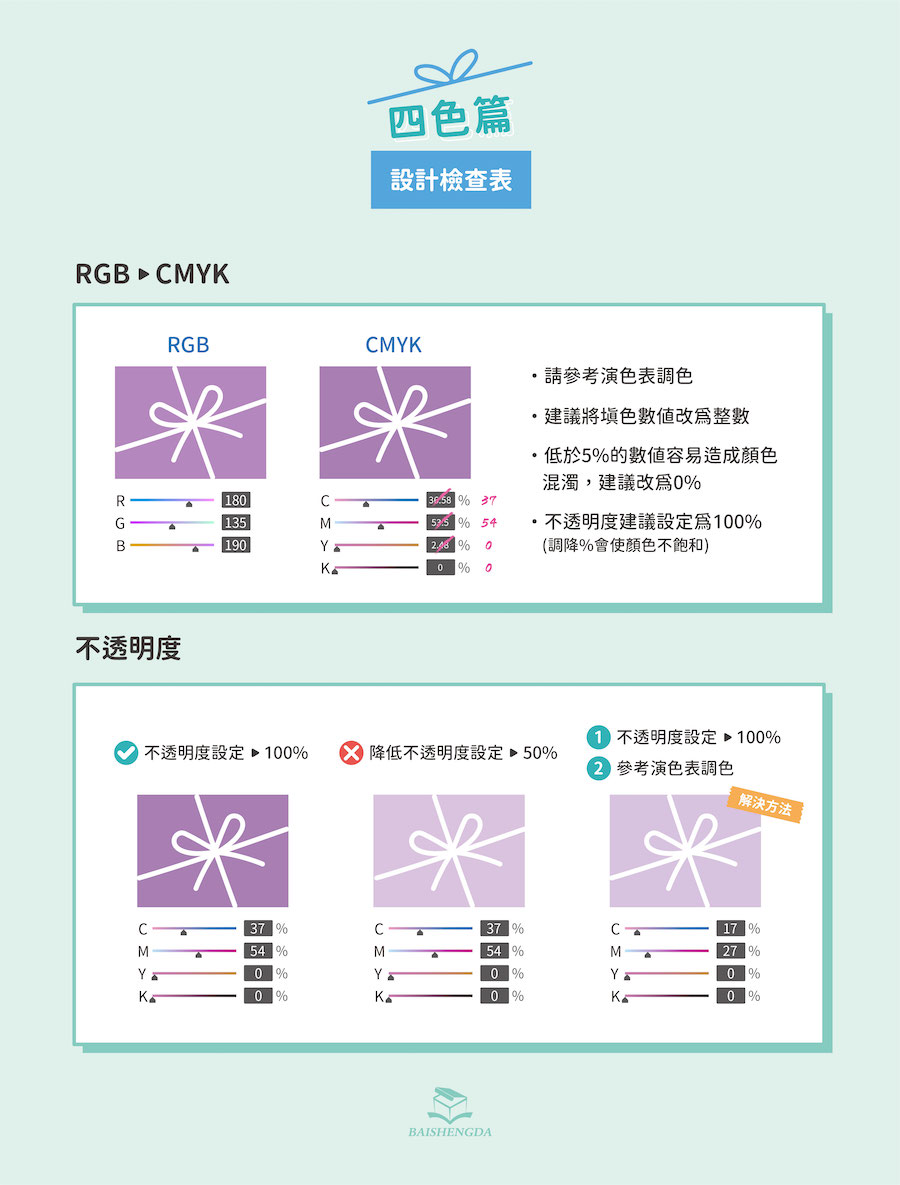 設計可以藉由不同的特效和設定來呈現不一樣的視覺感受,為了呈現最佳的印刷品質,建議將顏色的不透明度設為100%,降低不透明度會使油墨不飽和,因而透出紙張顏色造成色差。