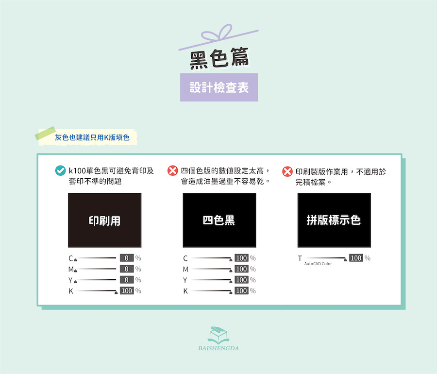 如同四色篇所述,疊加越多顏色會使顏色更混濁,所以黑、灰色建議以K版填色,此外,油墨有總量限制,CMYK加總後的數值超過250%統稱為四色黑,除了有套準的問題之外,油墨不易乾也會造成紙張背印或沾黏的問題,因此建議改為單色黑;拼版標示色(黑色)則是出版作業用的顏色,不適合用在完稿檔案中。