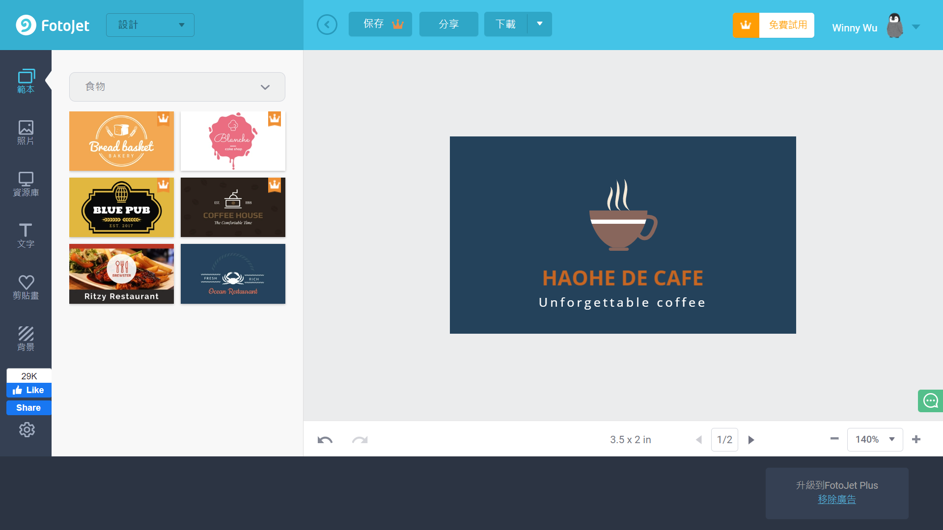 完成設計之後,可點選上方的下載,將作品存檔。Fotojet提供JPG和PNG兩種檔案類型。以名片設計為例,免費版檔案最高支援525 x 300px 的尺寸。下載成功後,便完成設計囉!